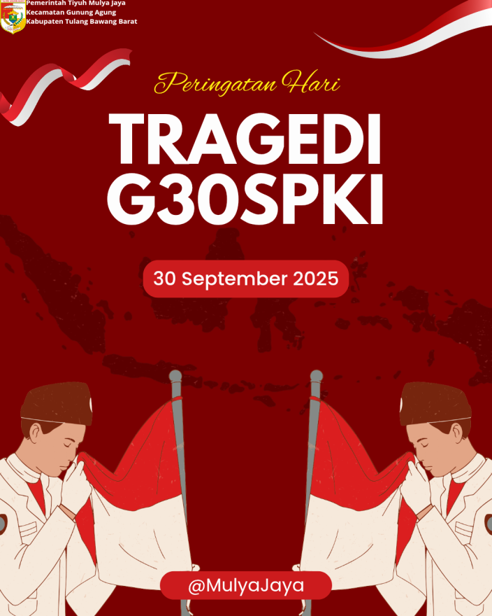 Dalam rangka memperingati hari tragedi G30S/PKI, Tiyuh Mulya Jaya dengan penuh khidmat mengenang dan menghormati jasa para pahlawan bangsa, khususnya Tujuh Jenderal yang gugur dalam peristiwa tersebut. Semangat keberanian, pengabdian, dan pengorbanan mereka akan selalu menjadi teladan bagi kita semua dalam menjaga keutuhan dan kedaulatan negara. Melalui peringatan ini, mari kita tingkatkan rasa cinta tanah air serta kewaspadaan terhadap upaya mengancam persatuan dan kesatuan bangsa, agar kejadian tragis serupa tidak terulang kembali di masa depan.